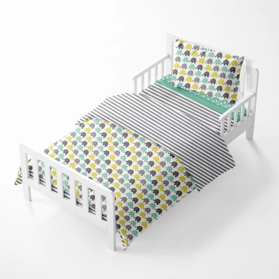 - This Bacati 4-piece Toddler Bedding Set Set Includes Reversible Oversize Comforter (42 x 55 inches), Toddler Bed Fitted Sheet(52 x 28 x 6 inches), Toddler Bed Flat Sheet(52 x 42 inches) which is fitted at the bottom to make the bed easily and Standard Pillow Case (20 x 25 inches) with french ties on the back in fun, colorful and signature prints in 100 percent cotton 200 Thread Count percale fabrics. Designed in United States by Experienced Designers. Many coordinating items available to purchase separately in this Bacati Elephants Mint Yellow Gray Bedding Collection.