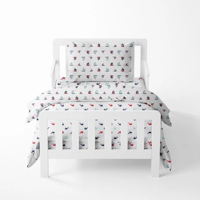 - This Bacati 4-piece Muslin Toddler Bedding Set Set Includes Reversible Oversize Comforter (42 x 55 inches), 2 Toddler Bed Fitted Sheets (52 x 28 x 6 inches) : One is boats print and another one in whales print and Standard Pillow Case (20 x 25 inches) with french ties on the back in fun, colorful and signature prints in 100 percent cotton Muslin fabrics. Designed in United States by Experienced Designers. Many coordinating items available to purchase separately in this Bacati Little Sailor Boats/Whales Boys Muslin Bedding Collection.