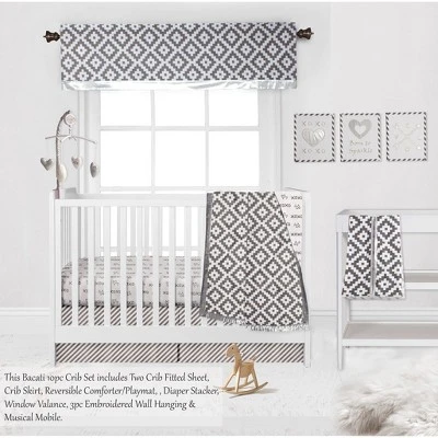 - This Bacati 10-piece Crib Set Includes Reversible Comforter/Playmat (33 x 43 inches), Two Crib fitted sheets (52 x 28 x 6 inches), Crib Skirt/Dust ruffle (13 inch drop) Diaper Stacker (holds more than 30 newborn diapers), Window Valance (15 h x 56 w inches with 1.75 inch Rod Pocket), 3 pc Wall Hangings Set and Musical Mobile in fun, colorful and signature prints in 100 percent cotton 200 Thread Count percale fabrics. Designed in United States by Experienced Designers. Many coordinating items available to purchase separately in this Bacati Love Gray/Silver Bedding Collection.