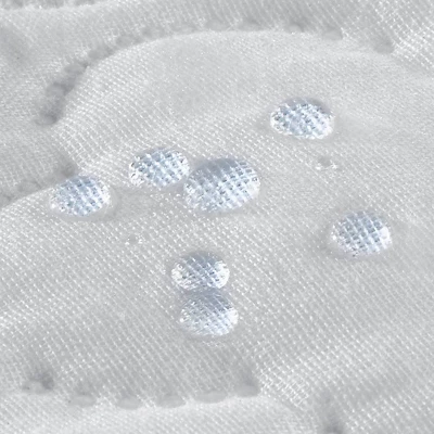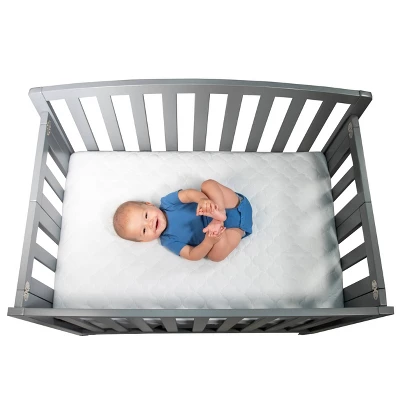 The Sealy Waterproof Protection Fitted Mini Crib Mattress Pad keeps baby’s mini crib mattress fresh, comfy, and well protected. A premium waterproof barrier offers protection from leaks, spills, and moisture for easy cleaning. The soft, knit top is comfortable for infants and toddlers, while the quilted cushioning keeps your little one cozy. Plus, the hypoallergenic fill is made from recycled plastic bottles for a greener crib pad in baby’s sleeping area. Sized at 38 inches x 24 inches, this crib pad is designed to fit mini crib mattresses with a depth of 2-5 inches. The deep pocketed Secure Stay skirt stretches to wrap snuggly under baby’s mattress, and an elastic edge helps prevent sliding, shifting, and bunching for added security. This machine washable and dryer friendly pad has been extensively safety, quality, and durability tested.